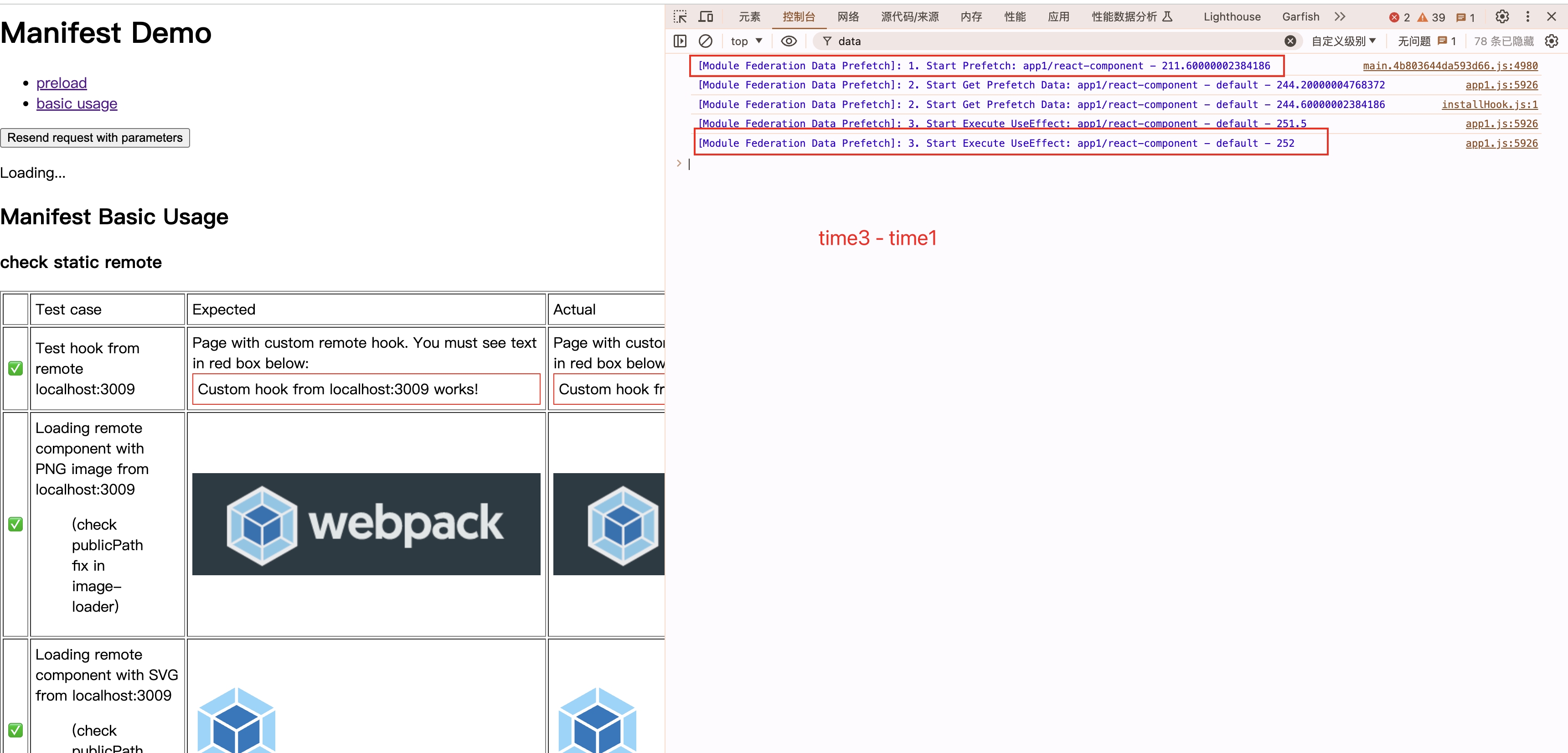 Data Prefetch can advance the remote module interface request to be sent immediately after remoteEntry is loaded, without waiting for component rendering, thus improving the first screen speed.